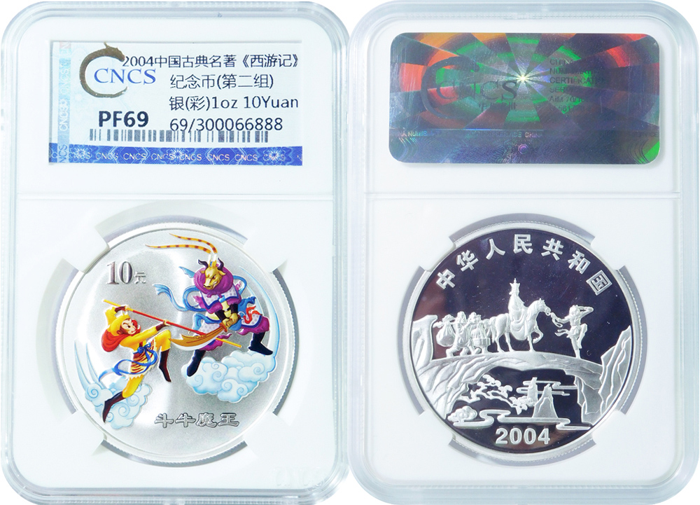 編號:2004-0504-ag-1oz,年號:2004,國別:中國,面額:10元,材質(zhì):彩銀,成色:99.9%,質(zhì)量:精制,重量:1oz,形狀:圓形,直徑:40mm,發(fā)行量:38000枚。