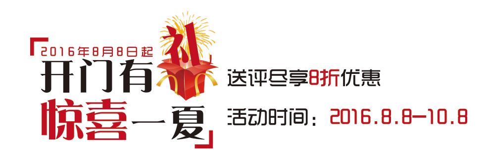 開業酬賓:送評盡享八折優惠,活動時間為2016年8月8日至2016年10月8日。